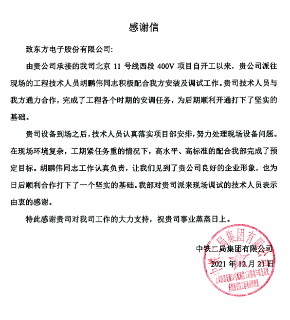 截至目前共有股份公司收到来自国网北京市电力公司、国网天津市电力分公司、国网冀北电力有限公司张家口供电公司、国网冀北廊坊供电公司的感谢信;威思顿公司收到来自国网冀北电力有限公司张家口供电公司的感谢信;国网中电公司收到来自国网冀北电力有限公司张家口供电公司的感谢信;玉麟公司收到来自中铁二局集团有限公司的感谢信。